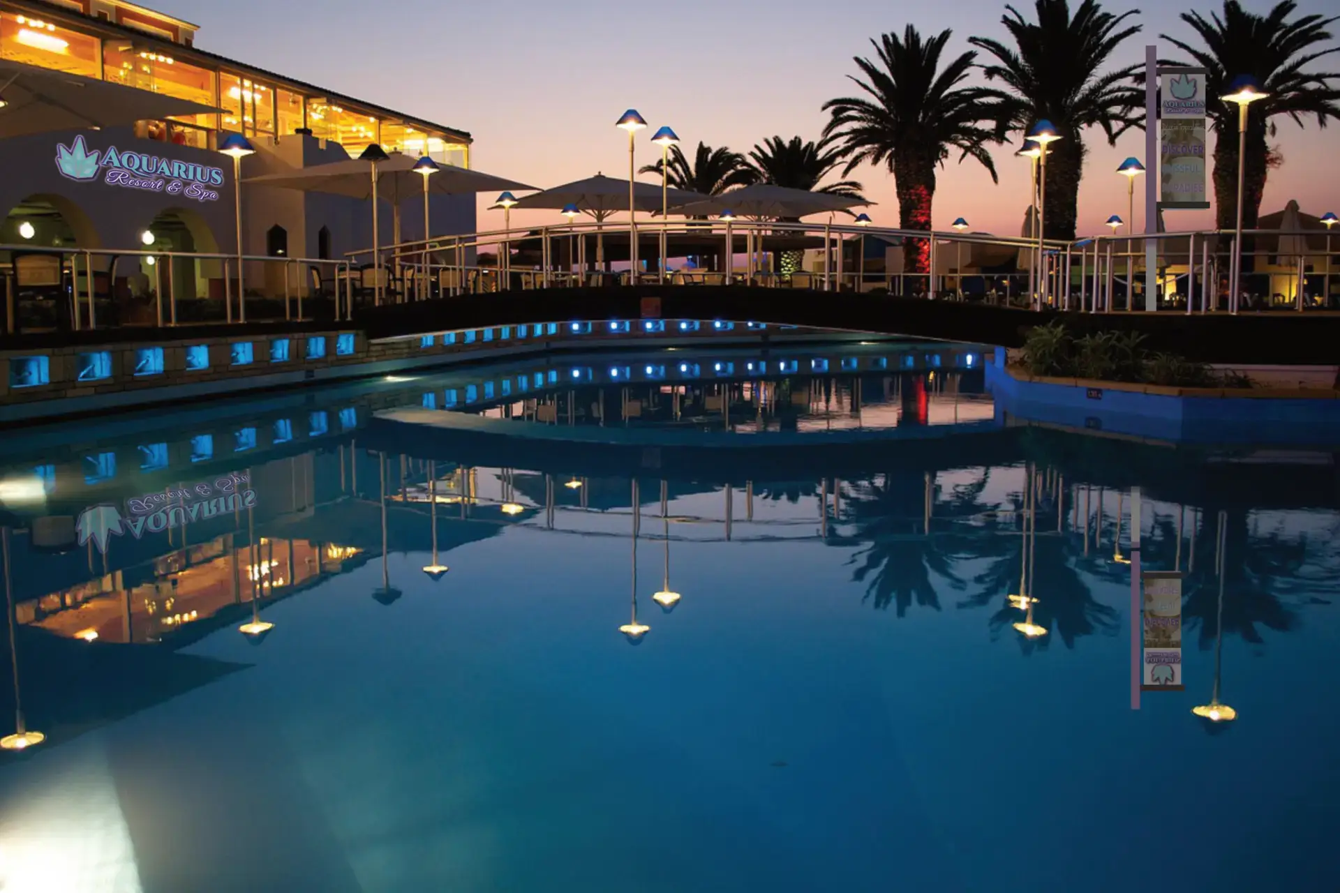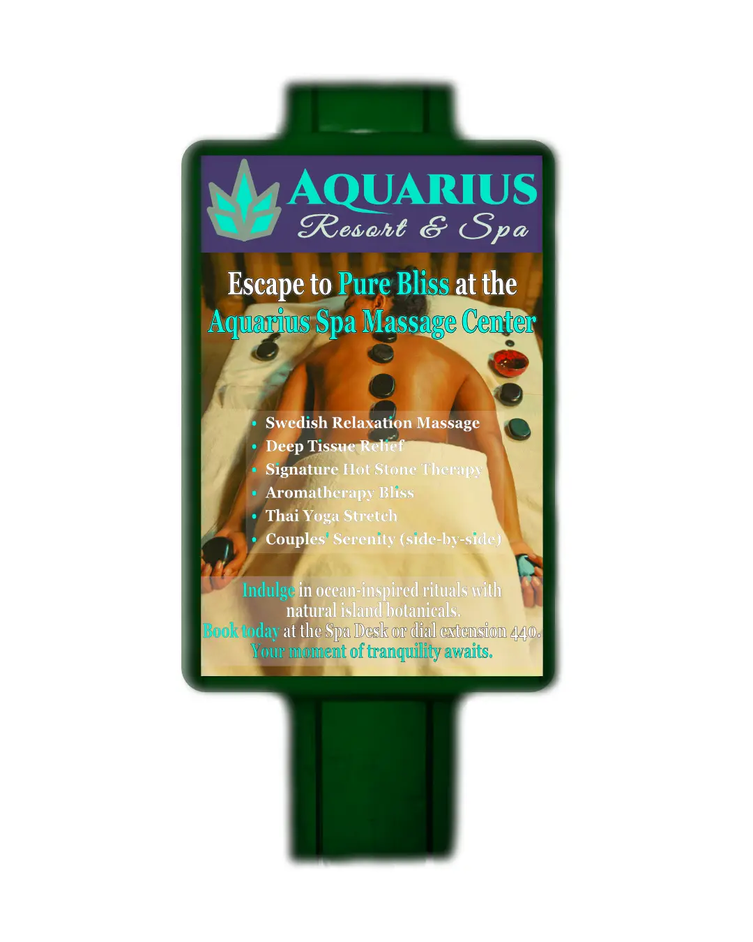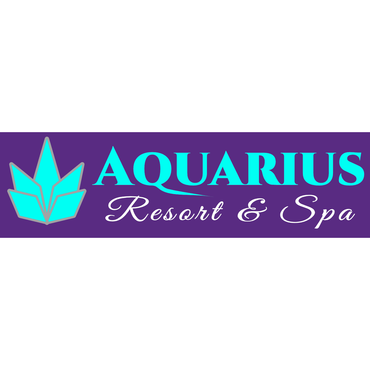 Designed logo for Aquarius Resort & Spa, combining a stylized leaf symbol with fluid elements in a purple/teal palette. This emphasizes tranquility and luxury, scalable for signage, web, and print—ideal for hospitality brands seeking a calming, upscale identity. The warm, magical feel emphasizes the brand’s “escape” theme, illustrating how branding can adapt beautifully to different moods.
