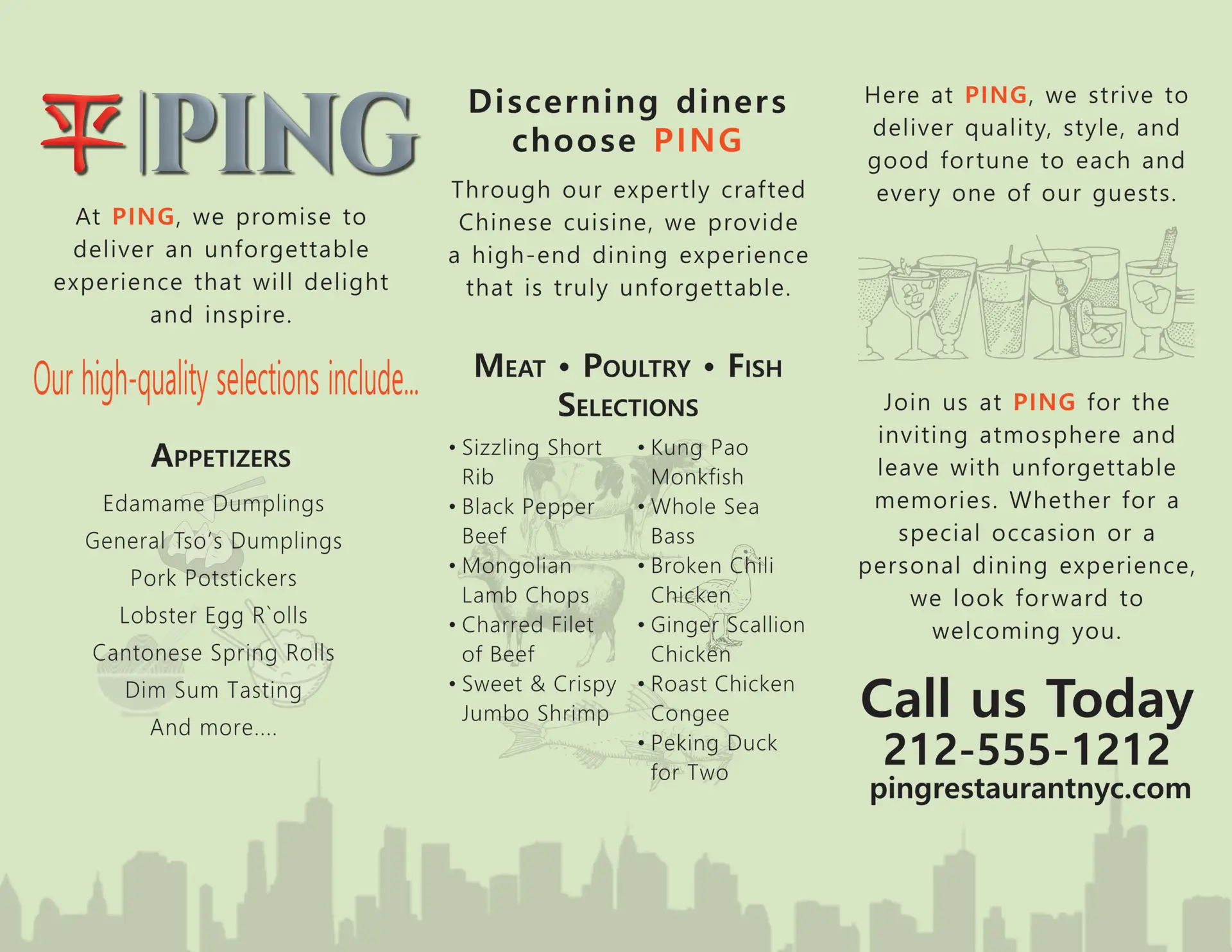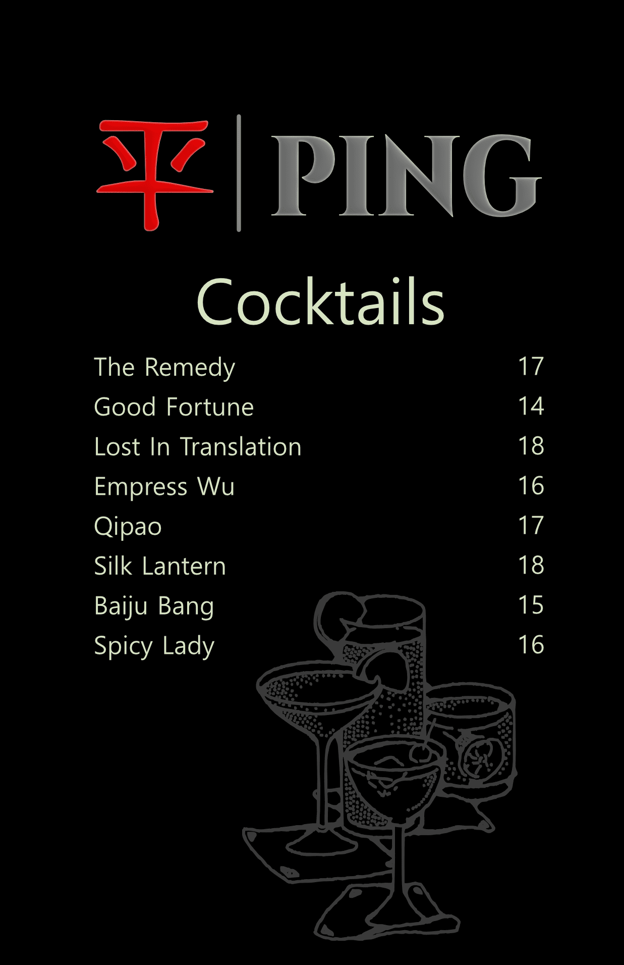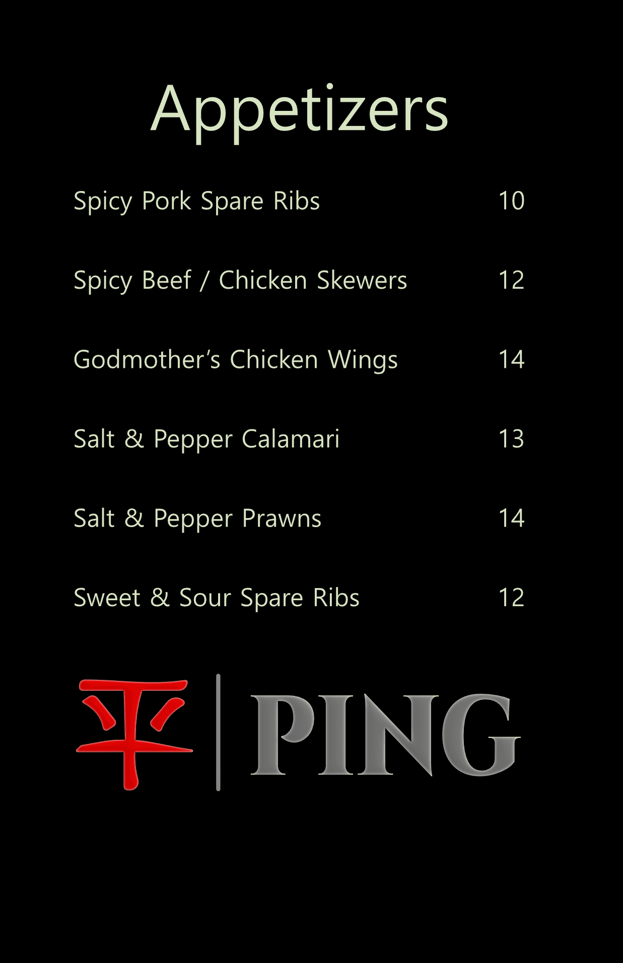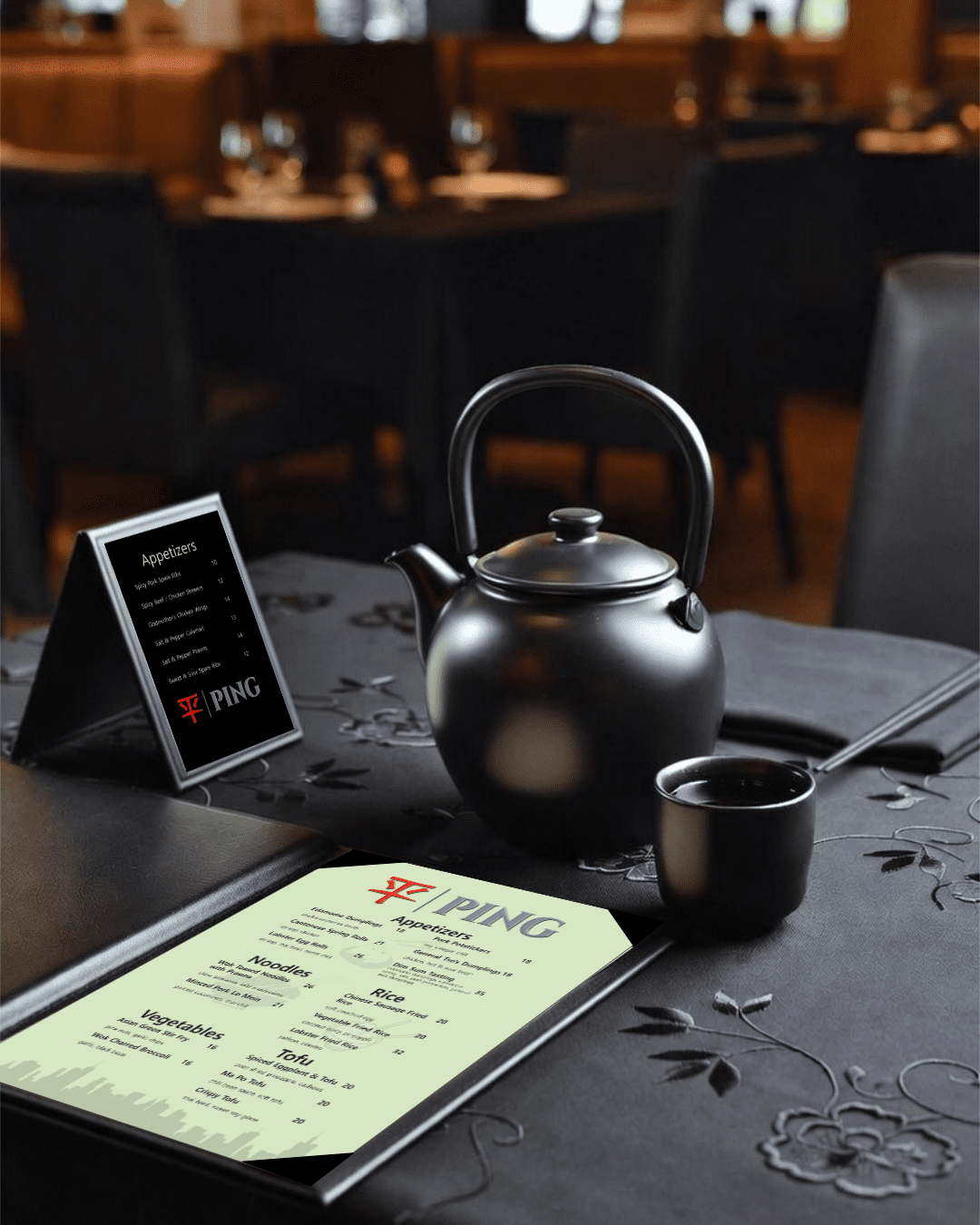 Designed a menu and branding system for Ping Chinese Restaurant, high-contrast text and icons for readability, showcasing print materials that elevate a restaurant’s story and menu presentation. Included in the system are the main menu, table tent and trifold brochure.
